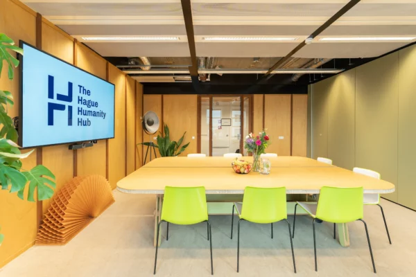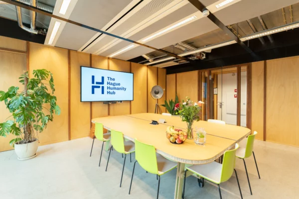The bright windows, the green wall and natural wood furnishing make it a relaxing environment in a quiet corner of the Humanity Hub. The room has a large table that can comfortably accommodate up to 12 guests.