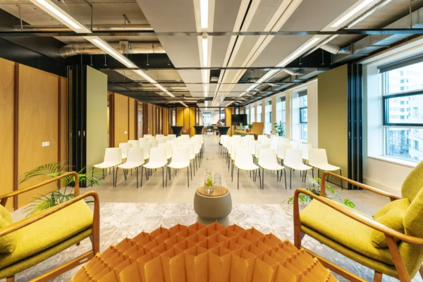 The space in Forest can be configured dynamically to better support your large events. The room offers windows with view on the Hague city centre on one side and glass walls on the other side, creating a bright and welcoming space for your event, offering natural daylight, optional stage, microphones, and a great setting for meaningful conversations